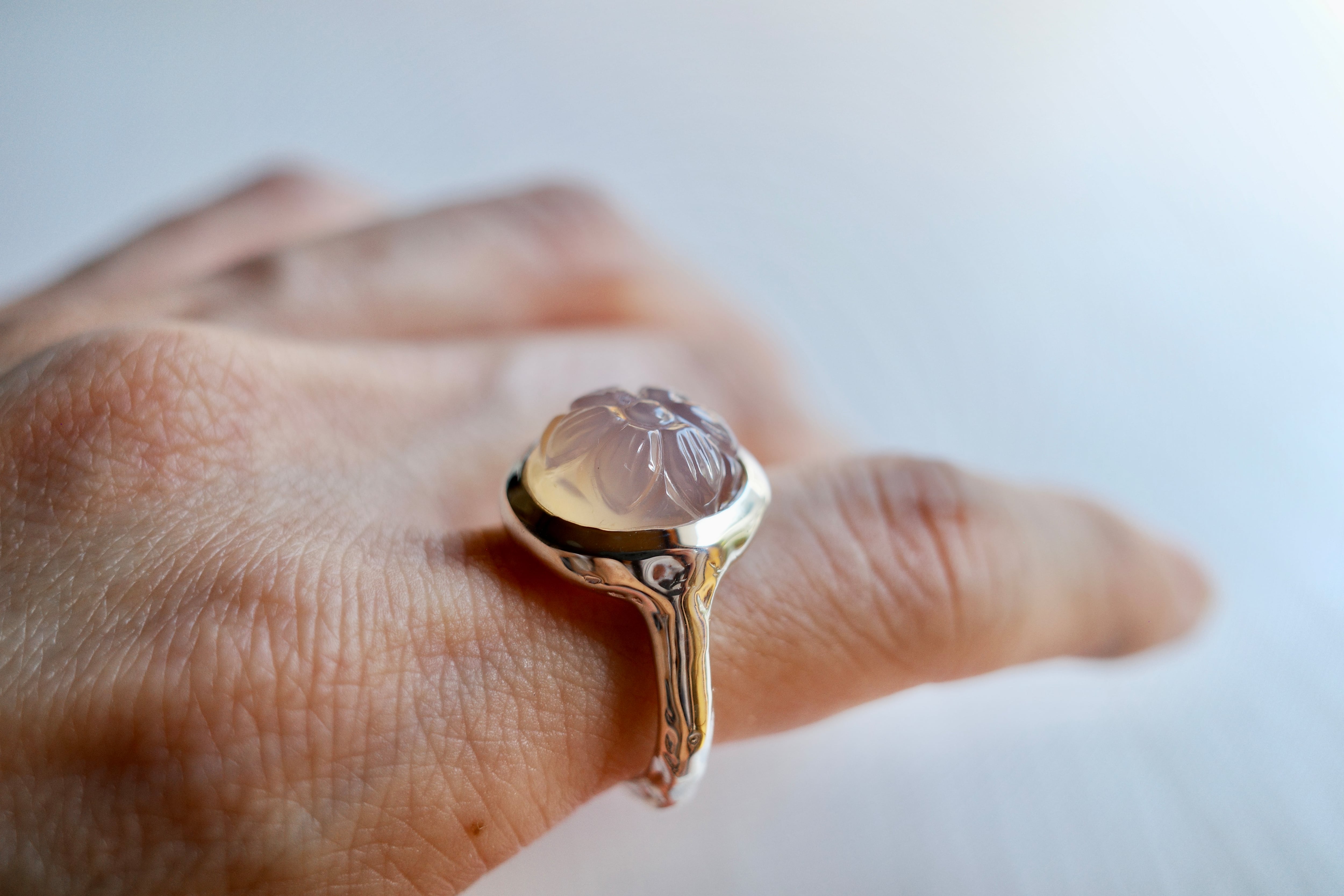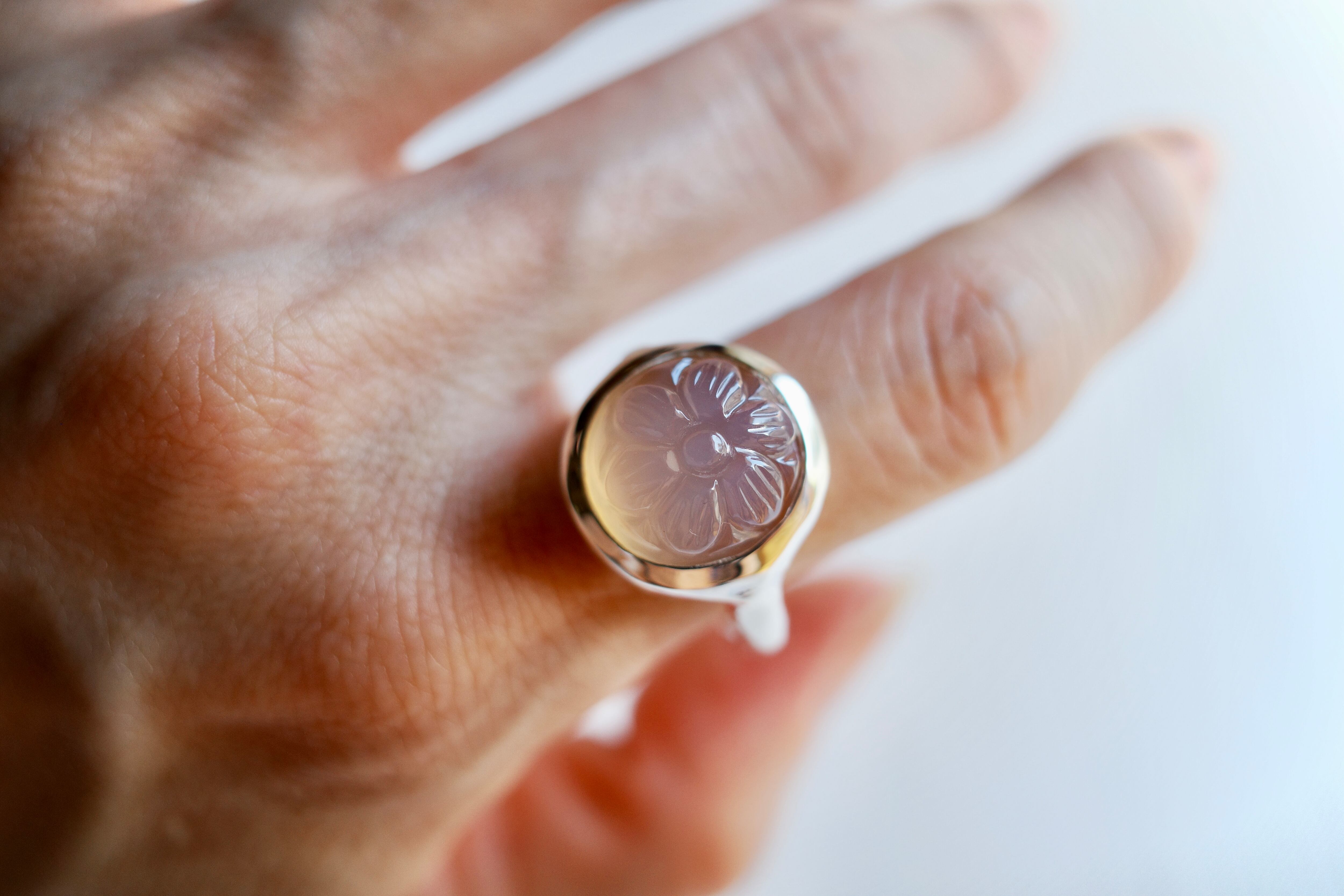 flower ring rose quartz (ローズクォーツ) フラワーリングシリーズ ローズクォーツに手彫りのフラワーが施され、 飴玉のような優しげで涼しげなring size 12号 material silver925 stone size w14mm × d14mm × h9mm