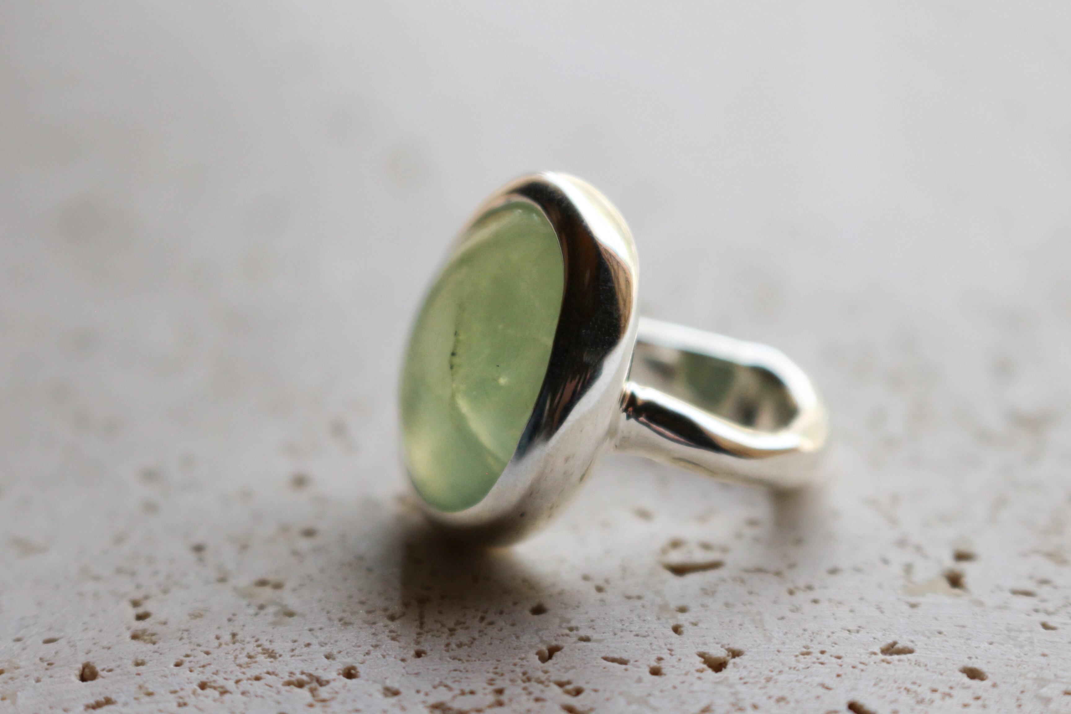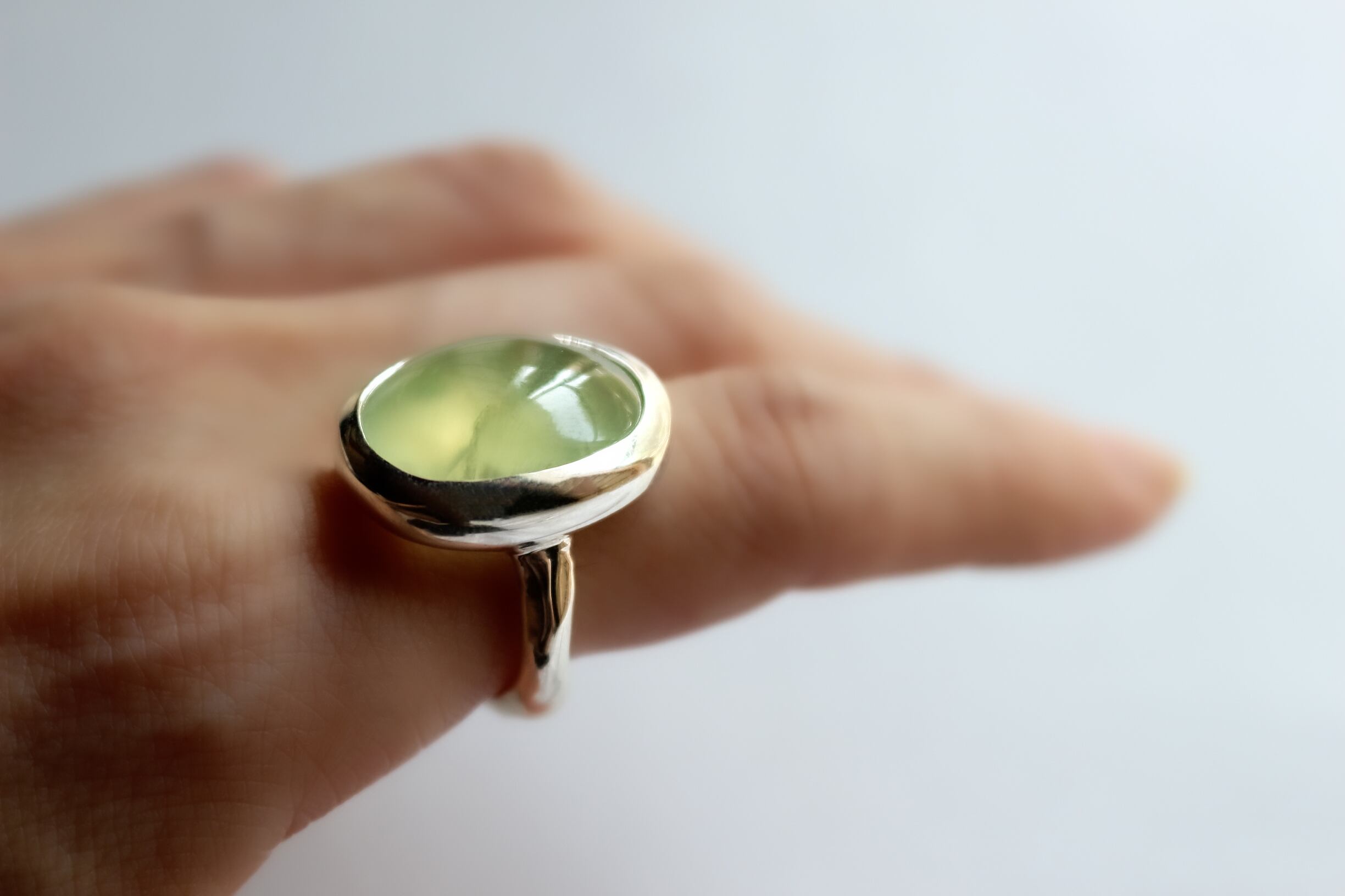 prehnite ring (プレナイト) マスカットのような瑞々しい色合いのグリーン。 光の透過によってカラーストーンの色が最大限に発揮される太陽の下で、是非リングをご覧いただきたいです。 size 11号 material silver925 stone size w18mm×d20mm×h9mm