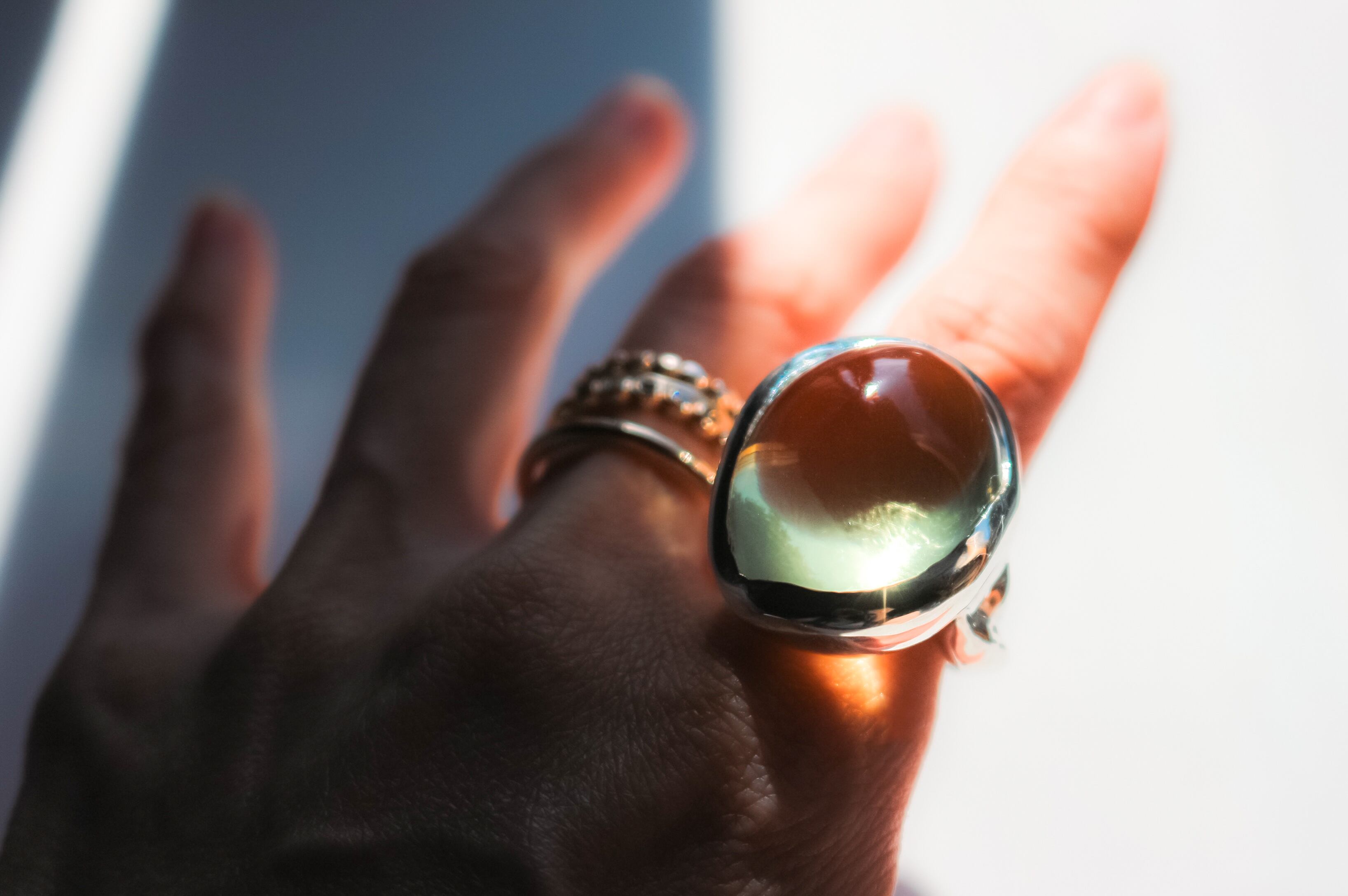 lemon quartz ring (レモンクォーツ) 大粒の透明度の高いレモンクォーツ。 レモンクォーツを包み込むように、 リングも2本をクロスさせた重厚感あるユニークなデザイン。 size 15号 material silver925 stone size w22mm×d28mm×h13mm